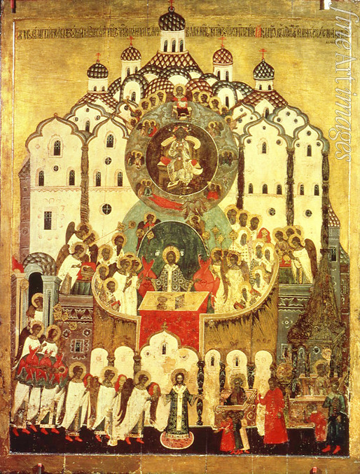 Musik, Ikone, Ikonenmalerei, Bibel, Engel, Neues Testament, "Assunta", Anbetung des Christuskindes, Jesus Christus, Höhepunkt, Vollendung, Liturgie, Orthodoxe Kirche, Russische Kirche, Gottesmutter auf dem Thron, Thronende Madonna, Synaxis, Versammlung, Christus auf dem Thron, Thronende Christus, Verherrlichung, Kirchliches Fest