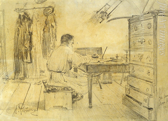 Der Schriftsteller Lew Tolstoi in seinem Arbeitszimmer