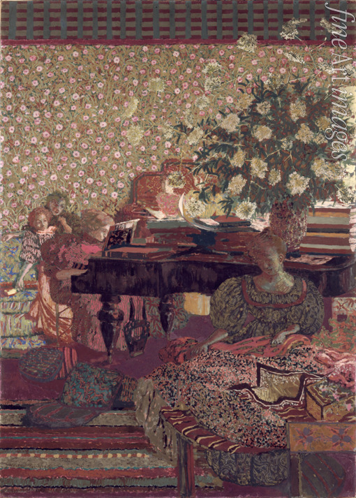 Frankreich, Musik, Dame, Frau, Im Zimmer, Idyll, Musikinstrumente, Haus, Junge Frau, Interieur, Familienleben, Kinder, Kind, Familie, Rast, Musiker, Musikant, Musizieren, Frauenbildnis, Frauenporträt, Buch, Alltag, Familienszene, Genreszene, Kindheit, Ruhe, Heim, Friede, Wohnen, Wohnzimmer, Wohnung, Familienporträt, Klavier, Lesen, Lesende, Mädchen am Klavier, Beim Lesen, Lektüre, Musikinstrument, Piano