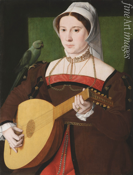Porträt einer Laute spielenden Frau mit einem Papagei auf der Schulter