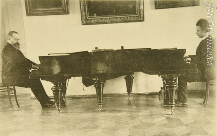 Komponisten Sergei Tanejew und Alexander Goldenweiser spielen Klavier