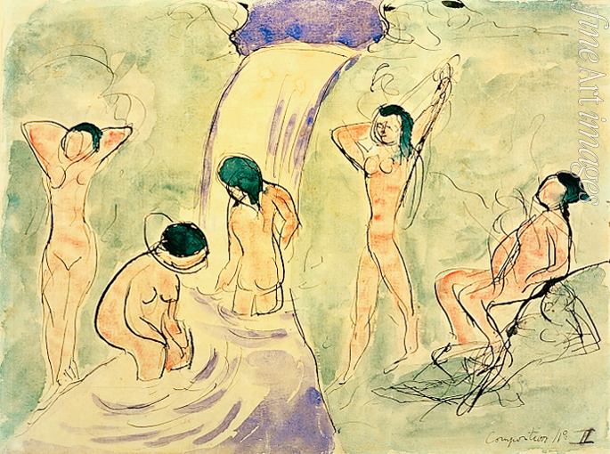 Dekorativ, Fauvismus, Frankreich, Nackt, Nacktheit, Farbigkeit, Nackte Frau, Baden, Fluss, Ufer, Badende, Frauen, Aquarell, Wasserfall