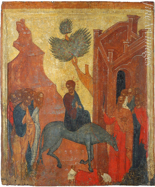 Ikone, Ikonenmalerei, Bibel, Neues Testament, Esel, Jerusalem, Frieden, Jesus Christus, Orthodoxe Kirche, Russische Kirche, Ostern, Palmsonntag, Karwoche, Fastenzeit, Salweidesonntag, Christusbild, Heilige Woche, Große Woche, Friedenskönig, Goldenes Tor, Das Goldene Tor, Palmwedeln, Palmzweige, Heiligenstadt, Maschiach, Einzug in Jerusalem, Kirchliches Fest