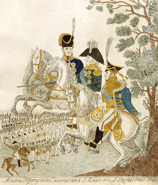 Frankreich, Russland, Naive Kunst, Feldmarschall, Russisch-französischer Krieg, Napoléon Bonaparte, Kaiser der Franzosen, Moskau, Krieg, Folklore, Primitivismus, Volkskunst, Feldzug, Russische Armee, Napoleon I., Napoleon, Oberbefehlshaber, Vaterländischer Krieg, 1812, Grande Armée, Russlandfeldzug, Napoleonische Kriege, Michail Illarionowitsch Kutusow, Michail Kutusow, Feldmarschall Kutusow, Oberbefehlshaber des russischen Heeres, Heer, Truppen, Koalitionskriege, Kutusow, Helden des Krieges, Platow, Witgenstein, Lubok, Überlieferung, Volksbilderbogen