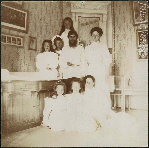 Grigori Rasputin mit Kaiserin Alexandra Fjodorowna, ihren fünf Kinder und (rechts sitztend) Gouvernantin Maria Wischnjakowa