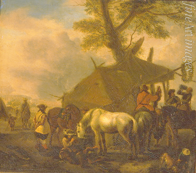 Abend, Barock, Reiter, Rast, Kavallerie, Soldaten, Krieger, Ross, Lager, Krieg, Militär, Zelt, Tränke, Viehtränke, Wasserstelle, Erholung, Ruheplatz, Durst, Holländisches Landschaft