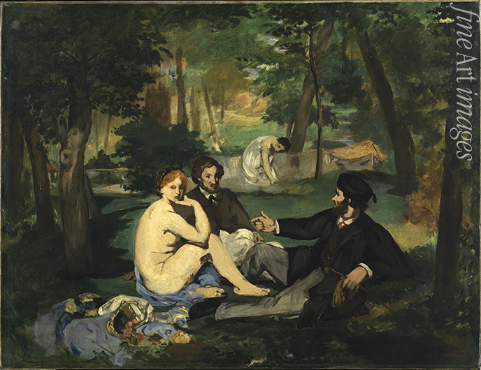 Sommer, Frankreich, Jahreszeiten, Poesie, Sonnenlicht, Bäume, Gespräch, Licht, Farbigkeit, Dame, Gesellschaft, Lustige Gesellschaft, Picknick, Frühstück, Auf dem Rasen, Park, Wald, Kavalier, Impressionismus, Impressionisten, Das Frühstück im Grünen