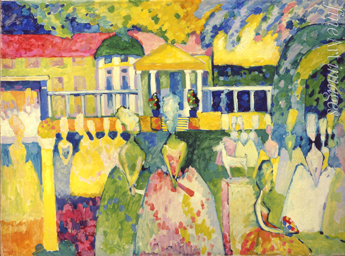 Licht, Farbigkeit, Garten, Hütchen, Junge Damen, Damen, Mode, Extravagant, Frauen, Entartete Kunst, Russische Avantgarde, Blauer Reiter, Expressionismus, Expressiv, Damen mit Reifröcke, Landgut, Herrenhof, Villa, Ironie, Reifröcke, Reifrock, Abendgarderobe, Bekleidung, Kleidung, Kleid, Krinoline, Krinolinenmode