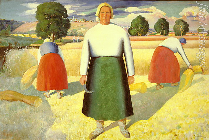 Sommer, Sonne, Dekorativ, Dorf, Natur, Jahreszeiten, Sommerlandschaft, Bäume, Farbigkeit, Am Lande, Feld, Bauern, Bauernleben, Russland, Frauen, Ernte, Erntezeit, Russische Avantgarde, Erntearbeiter, Sichel, Schnitterinnen, Weizen, Mahd, Kubofuturismus