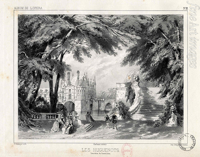 Schloss und Park von Chenonceaux. Bühnenbild des Zweiten Akts der Oper Les Huguenots (Die Hugenotten) von Giacomo Meyerbeer