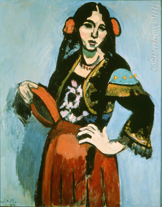 Dekorativ, Fauvismus, Frankreich, Musik, Farbigkeit, Wanderleben, Musikinstrumente, Spanierin, Junge Frau, Musiker, Musikant, Musizieren, Frauenbildnis, Frauenporträt, Modern, Wandermusikant, Expressiv, Tambourin, Tamburin, Musikinstrument