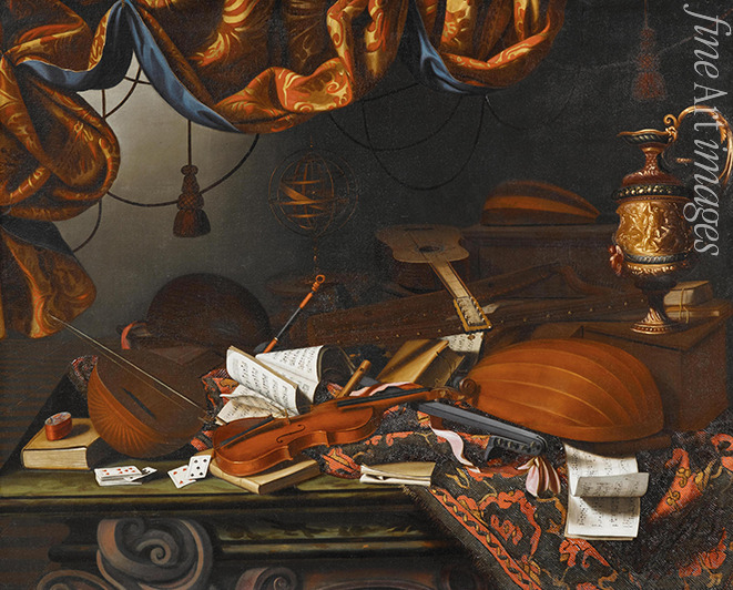 Musik, Am Tisch, Musikinstrumente, Violine, Flöte, Italien, Interieur, Barock, Musiker, Musikant, Musizieren, Bücher, Laute, Geige, Noten, Notenblätter, Partituren, Flötenspieler, Gitarre, Notenblatt, Globus, Stilleben mit Musikinstrumente, Flötist, Gitarrist, Gitarristin, Italienische Malerei, Musikinstrument, Lautenist, Lautenistin