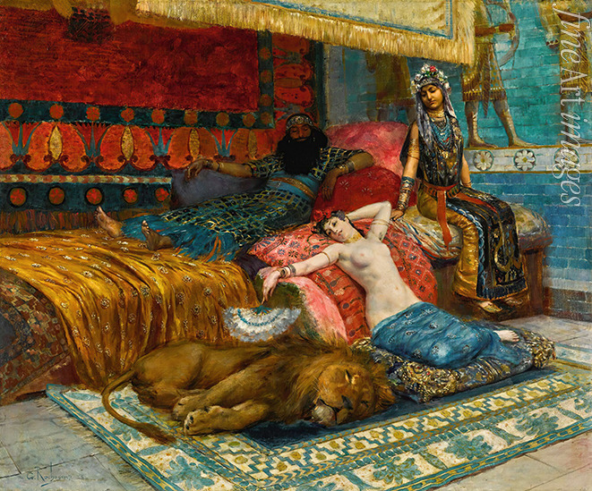 Melancholie, Romantik, Schönheit, Orientalisch, Junge Frau, Frauenbildnis, Frauenporträt, Turban, Harem, Orient, Moslemin, Moslemische Frau, Löwe, Serail, Odaliske