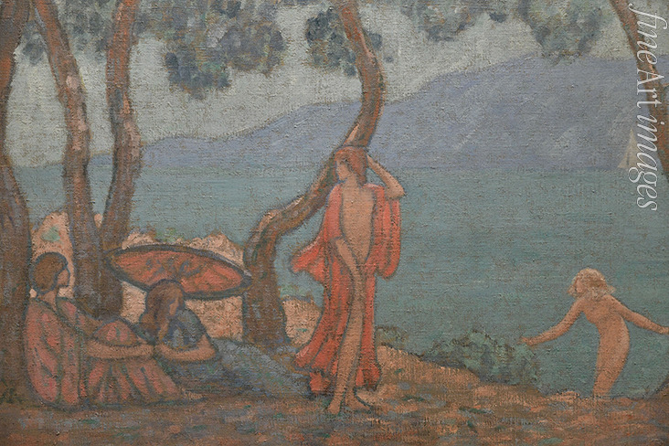 Porquerolles, l'Alycastre. Junge Frauen mit Sonnenschirm unter den Pinien