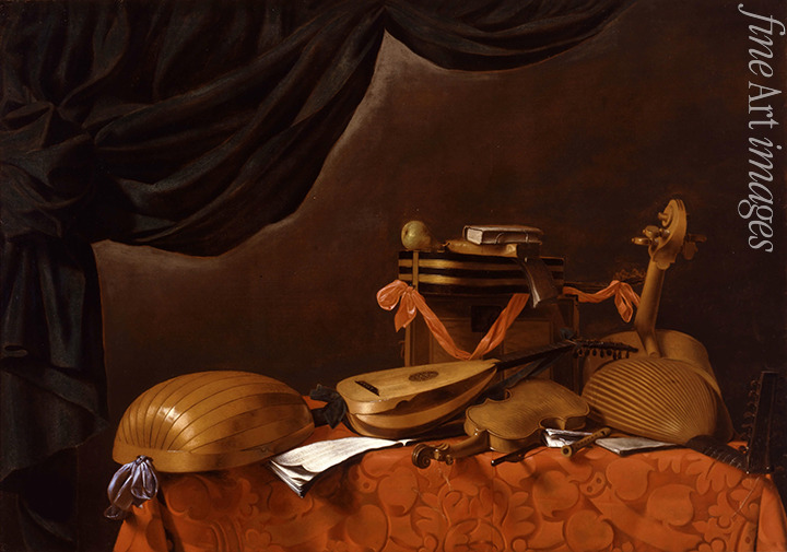 Musik, Am Tisch, Musikinstrumente, Violine, Flöte, Interieur, Barock, Musiker, Musikant, Musizieren, Laute, Geige, Noten, Notenblätter, Partituren, Gitarre, Notenblatt, Stilleben mit Musikinstrumenten, Gitarrist, Gitarristin, Italienische Malerei, Musikinstrument, Lautenist, Lautenistin