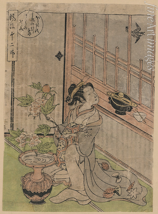 Blumen, Dame, Frau, Vogel, Holzschnitt, Japan, Edo-Zeit, Asien, Japanische Kunst, Fernosten, Ostasien, Ukiyo-e, Gackelkuckuck, Kuckuck, Azalee, Rikka