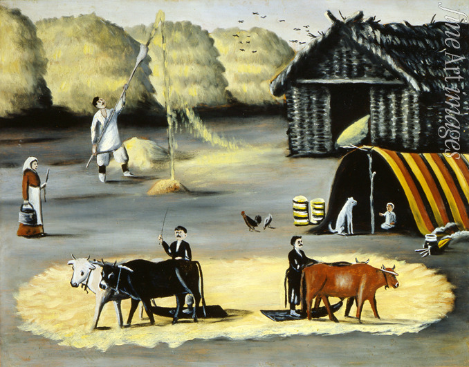 Dorf, Am Lande, Bauern, Bauernleben, Landwirtschaft, Naive Kunst, Erntezeit, Primitivismus, Volkskunst, Georgien, Tenne, Getreide dreschen, Dreschen, Dreschplatz, Dreschhof