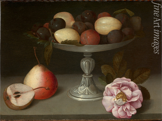Stillleben mit Pflaumen, Birnen und einer Rose
