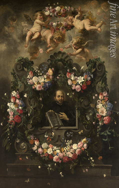 Der heilige Ignatius von Loyola in einem Blumenkranz