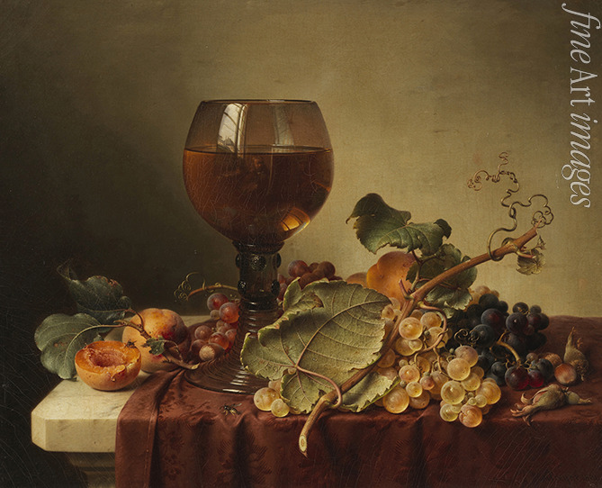 Stillleben mit Selbstportrait im Weinglas und Früchten