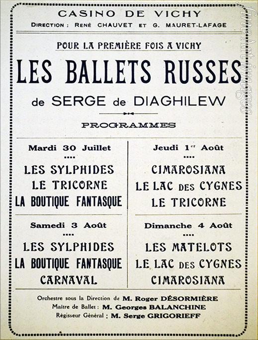 Affiche des Ballets russes du 30 juillet au 4 août 1929 à l'Opéra de Vichy