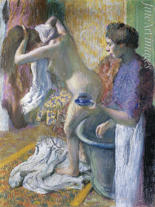 Morgen, Pastell, Nackt, Nacktheit, Licht, Farbigkeit, Dame, Nackte Frau, Am Bett, Körper, Schönheit, Impression, Frühstück, Badende, Kaffee, Bad, Toilette, Nach dem Bad, Haare, Akt, Kämmen, Impressionismus, Impressionisten, Badezimmer, Boudoir