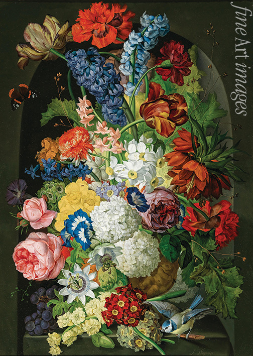 Blumenstillleben mit Schmetterling und Blaumeise