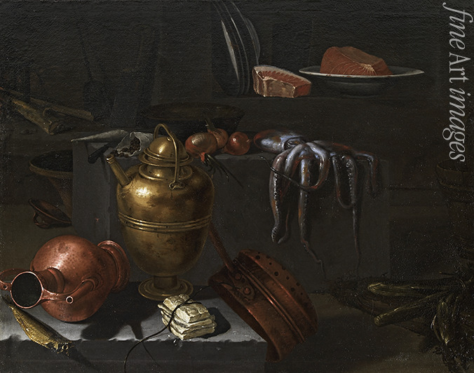 Kücheninterieur mit Kupfergeschirr, Oktopus und Zwiebeln auf einem Steinsims