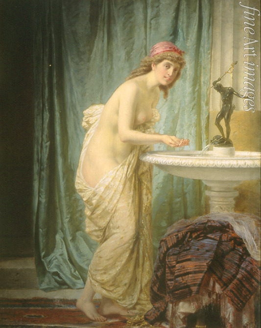 Morgen, Dame, Tageszeiten, Frau, Jugendstil, Bad, Junge Frau, Interieur, Spiegel, Waschbecken, Toilette, Toilettentisch, Schlafzimmer, Nachthemd, Aufstehen, Aufwachen, Bett, Bettkante, Alltag, Genreszene, Akt, Morgentoilette, Wiener Secession, Art nouveau, Modern Style, Modernisme, Stile Liberty, Reformstil, Stil Modern, Fin de siècle, Negligé, Negligée, Morgenmantel, Boudoir