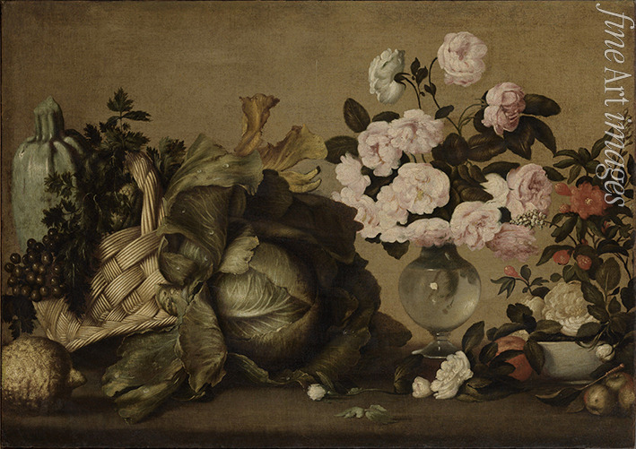 Stillleben mit Zucchini, Weintrauben, Petersilie, Kohl, Vase mit Pfingstrosen und Obst