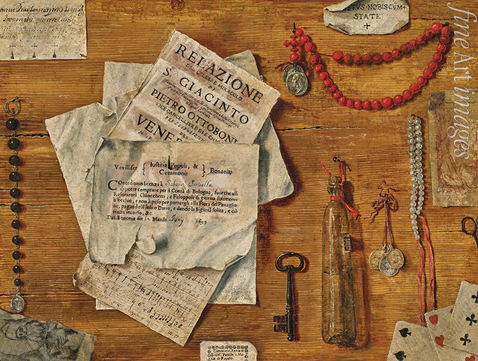 Trompe-l'oeil mit mehreren Blättern Papier, einem Schlüssel, Spielkarten und auf einem Holzbrett befestigten Gegenständen