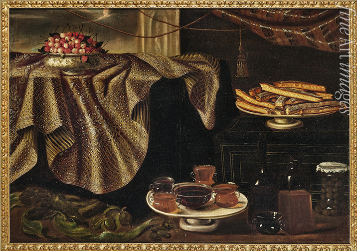 Kirschen in einer Porzellanschale auf einem drapierten Tisch, ein Keksteller, Gläser mit Honig und Marmelade
