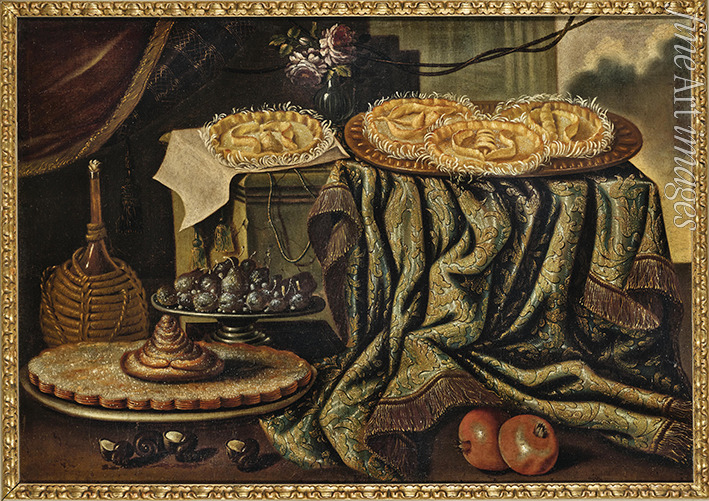 Kuchen und eine Glasvase mit Rosen auf einem drapierten Sims, eine Flasche und Zinnteller mit Gebäck und Obst