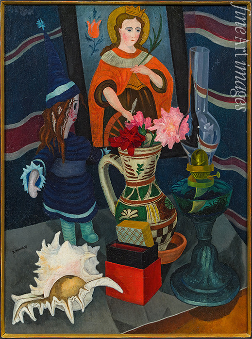 Stillleben mit Lampe, Muschel, Puppe und Hinterglasbild