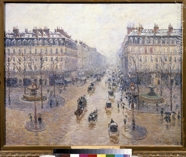 Winter, Paris, Schnee, Jahreszeiten, Stadtbild, Morgen, Großstadtszene, Straße, Licht, Mittag, Tageszeiten, Lichtwirkung, Impression, Häuser, Platz, Hauptstadt, Omnibus, Zentrum, Impressionismus, Impressionisten, Droschke, Avenue de l'Opéra