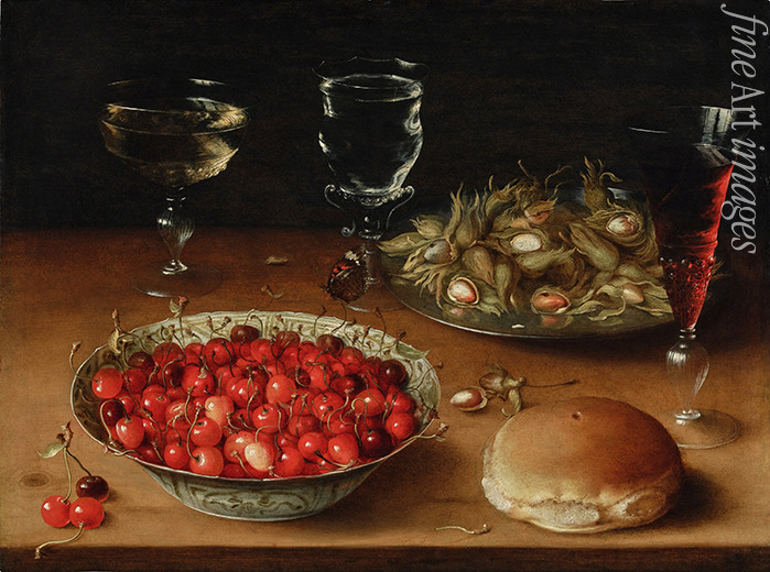Beert Osias der Ältere - Stillleben mit Kirschen in einer Wanli-Porzellanschale, Haselnüssen und drei Weingläsern im venezianischen Stil