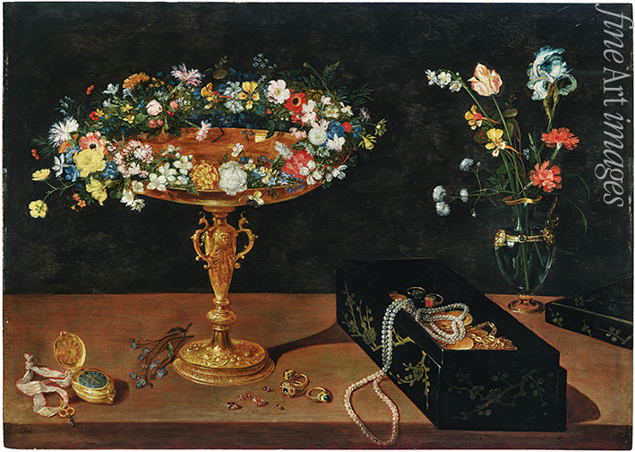 Eine Tazza mit Blumengirlande, Schmuckschatulle, Taschenuhr und Blumen in einer Glasvase