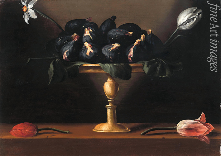 Tazza mit Feigen, Narzisse und Tulpen auf einem Holzsims