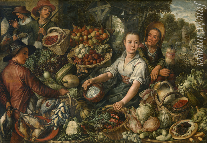 Bauern, Bauernleben, Obst, Bauer, Gemüse, Landfrau, Bäuerin, Auf dem Markt, Handel, Verkäufer, Verkäuferin, Bauernmarkt, Hühner, Körbe, Fässe, Tracht, Bauernfamilie, Markt, Gemüsehändler