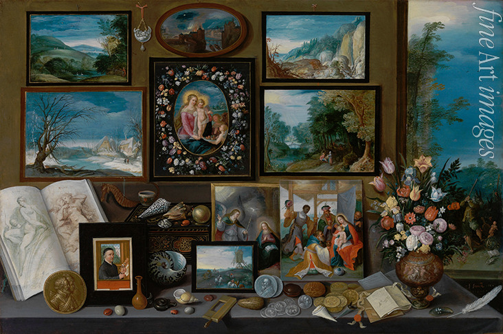 Das Kabinett eines Sammlers mit Gemälden, Muscheln, Münzen, Fossilien und Blumen