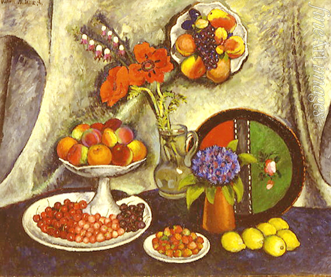 Keywords: Flowers, Vase, Fruits, Peaches, Tray, Russia, Dish, Jug, Still life, At the Table, Lemons, Russian Avant-garde, Saucer, Bunch of Flowers, Poppies, Cornflowers, Berry, Jack of Diamonds, Knave Of Diamonds, Neo-Primitivism