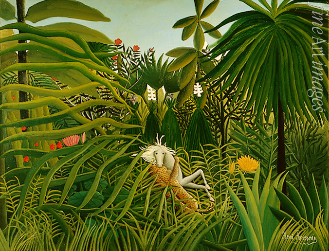 Trees, France, Paradise, Jaguar, Attack, Horse, Jungle, Naive Art, Tropical Flora, Wilderness, Fantasy, Fantasy world, Wild, Tropical Forrest, Rain forrest, Primitivism, Impressionism, Impressionists, Animals representation