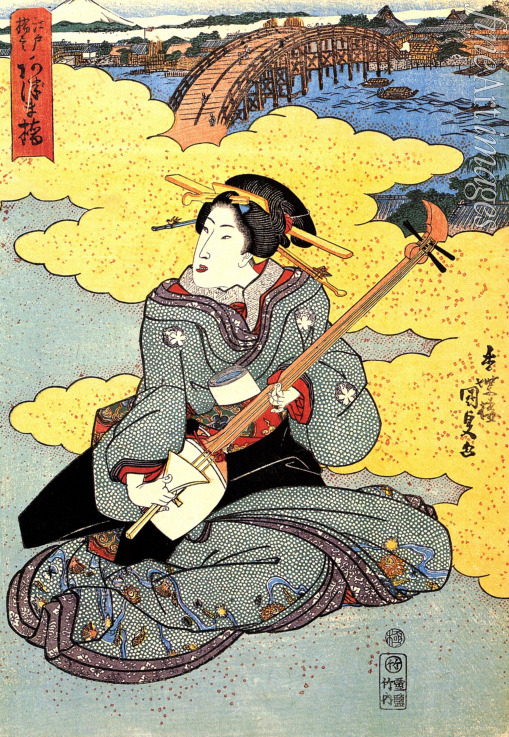 Keywords: Music, Girl, Music instruments, Asian, Musician, Play music, Woodcut, Far East, Japan, Edo period, Japanese Art, Asia, Ukiyo-e, Shamisen player, Shamisen