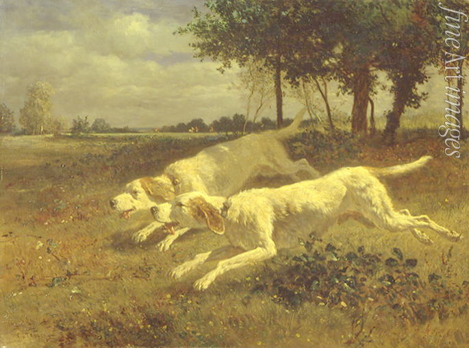 Nature, Seasons, France, Autumn, Clouds, Field, Meadow, Autumn landscape, Dog, Hunt, Hound, Barbizon, Realism, Pointer, Hunting, Fall, Running dogs, French painting, Animals representation