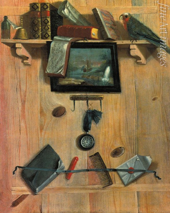 Fine, Elegant, Still life, Books, Sheets of music, Scores, Book, Pot, Letter, Writting implements, Pen, Quill, Writting case, Writting materials, Desk, Parrot, Trompe-l’œil, Trompe l'oeil, Trompe-l'œil, Trompe-l'oeil, Quills, Quill pen, Sheet music