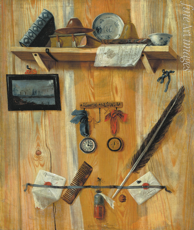 Fine, Elegant, Still life, Books, Scores, Book, Pot, Letter, Writting implements, Pen, Quill, Writting pad, Writting case, Writting materials, Inkpot, Desk, Inkwell, Trompe-l’œil, Trompe l'oeil, Trompe-l'œil, Trompe-l'oeil, Quills, Quill pen