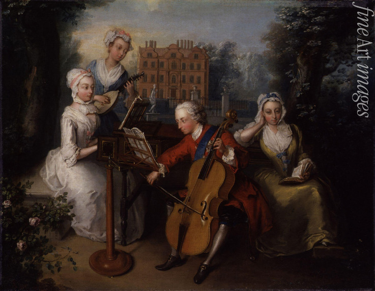 Keywords: Music, Music instruments, Violin, Flute, Ladies, Funny company, Park, Pleasure, Amusement, Pipe, Musician, Playing music, Music lovers, Rococo, Sheets of music, Scores, Nobility, Aristocracy, Entertainment, Gentlemen, Amusing, Amorous, Concert, Concert in a park, Musical instruments, Flautist, Musical instrument, Princess Amelia Sophia Eleanora, Anne, Princess of Orange, Princess Caroline Elizabeth, Frederick Lewis, Prince of Wales, Kew Palace, Flutist, Sheet music