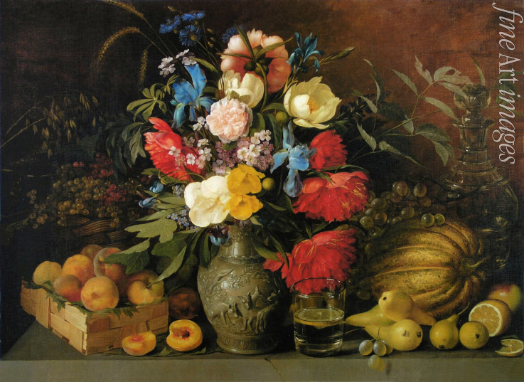 Flowers, Fruits, Bunch of Flowers, Peaches, Still life, At the Table, Pears, Grapes, Melon, Bouquet