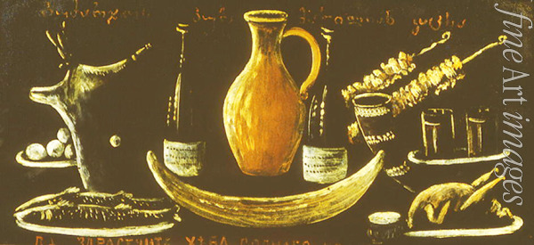 Wine bottle, Dinner, Supper, Covered table, Naive Art, Fish, Still life, Food, Broiled chicken, At the Table, Plate, Tradition, Feast, Banquet, Wine jug, Folklore, Primitivism, Folk art, Georgia, Horn, Spit, Feast meal, Ceremonial Dinner, Feast table