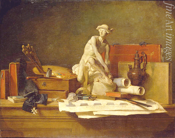Statuette, Jug, Still life, Palette, Rococo, Attributes of the Arts, Books, Portfolios, Paintbrushes, Paint box, Drawings, Engravings, Medal